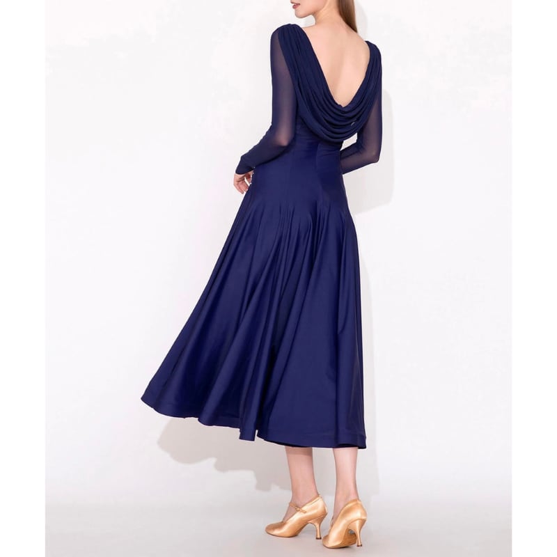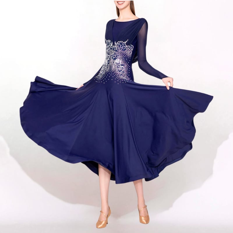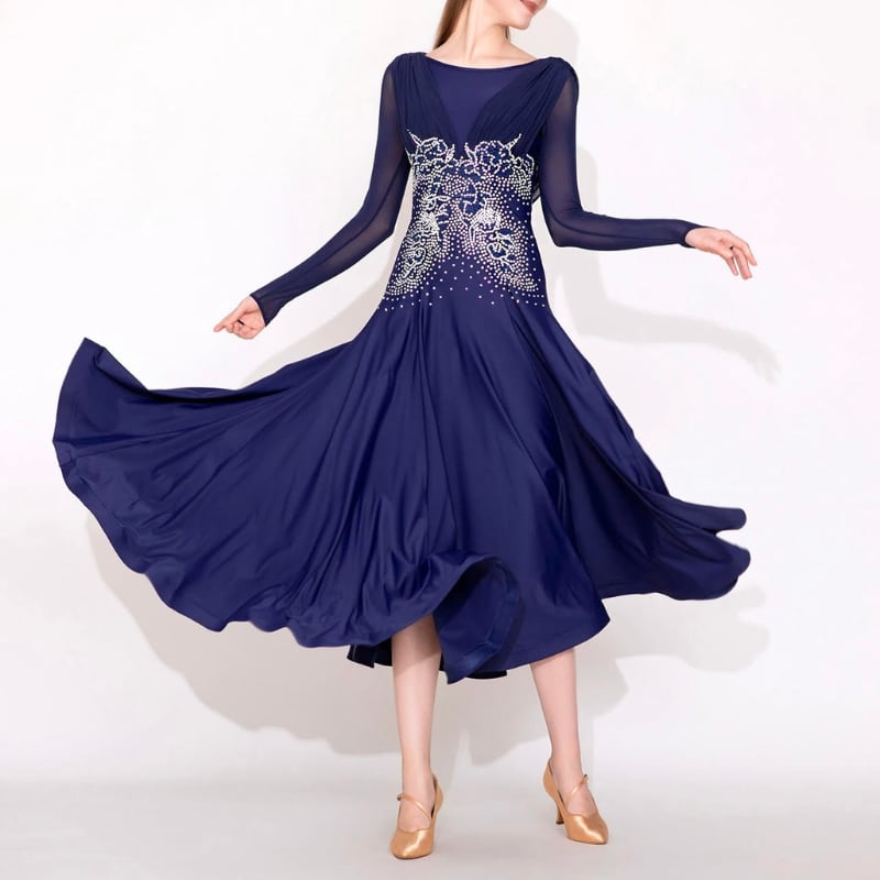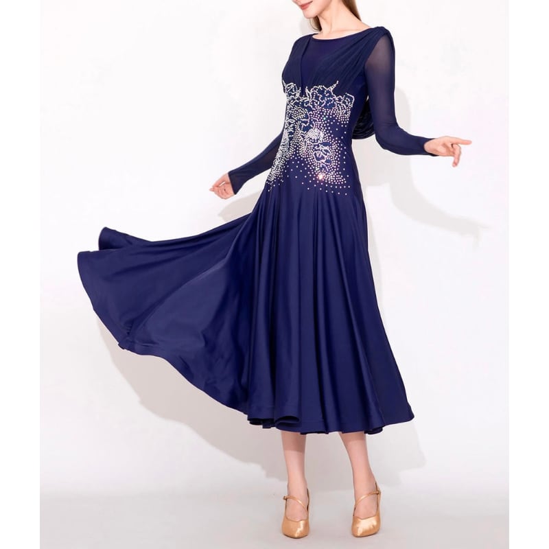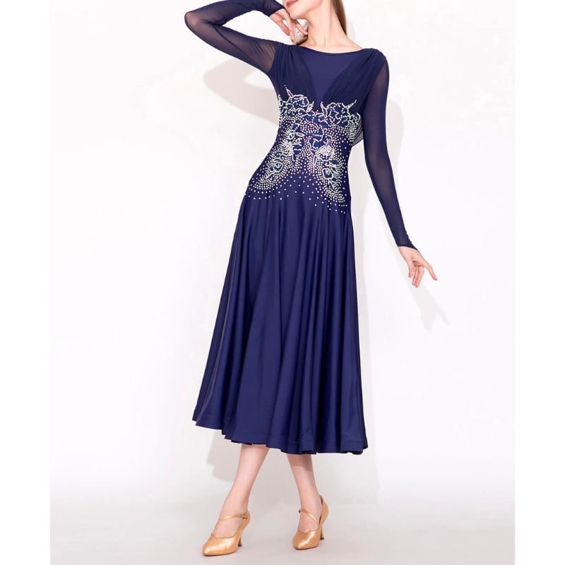 深みのあるネイビーに緻密なビジュー装飾を施した、気品溢れるロング丈のダンスドレス。