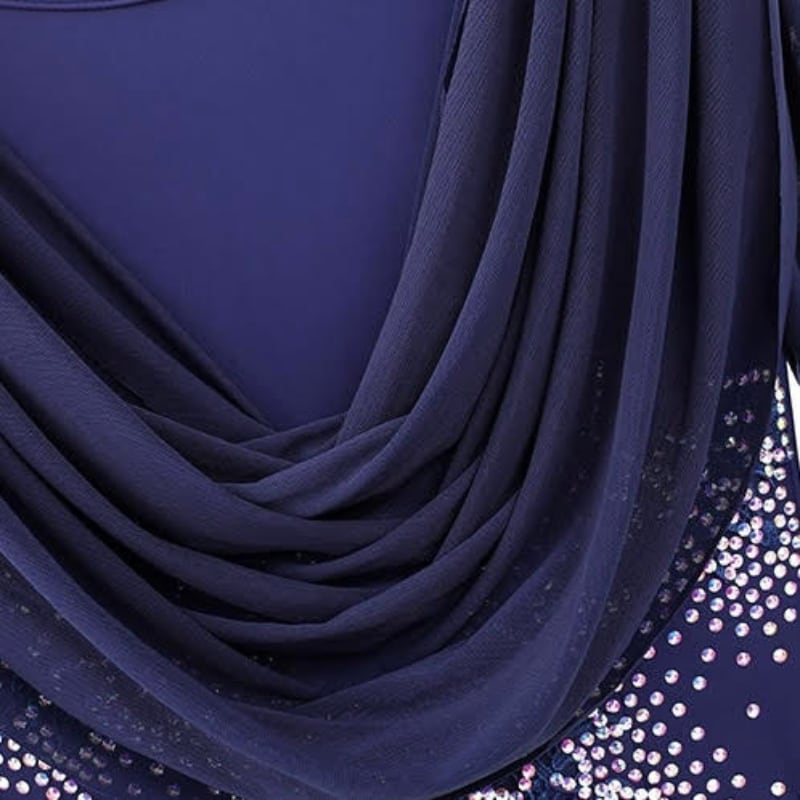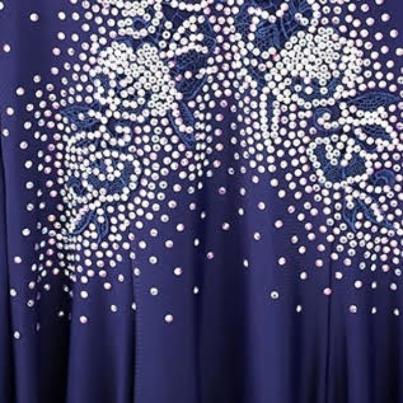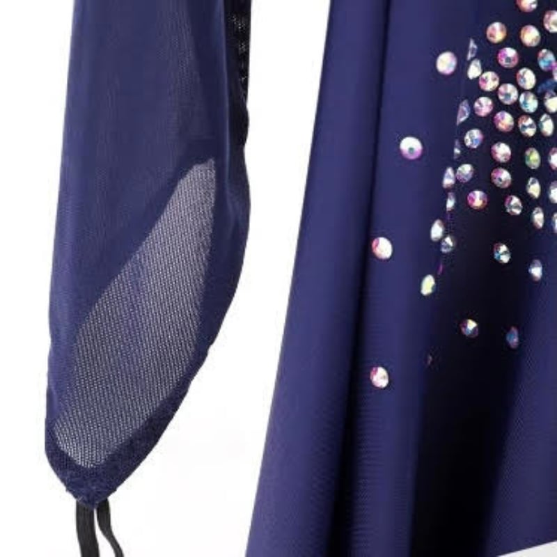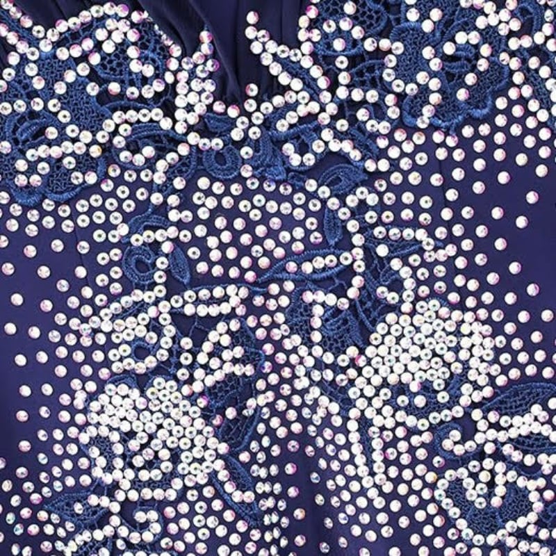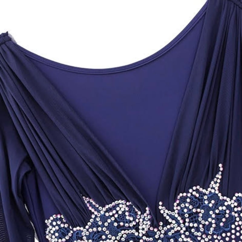 深みのあるネイビーに緻密なビジュー装飾を施した、気品溢れるロング丈のダンスドレス。