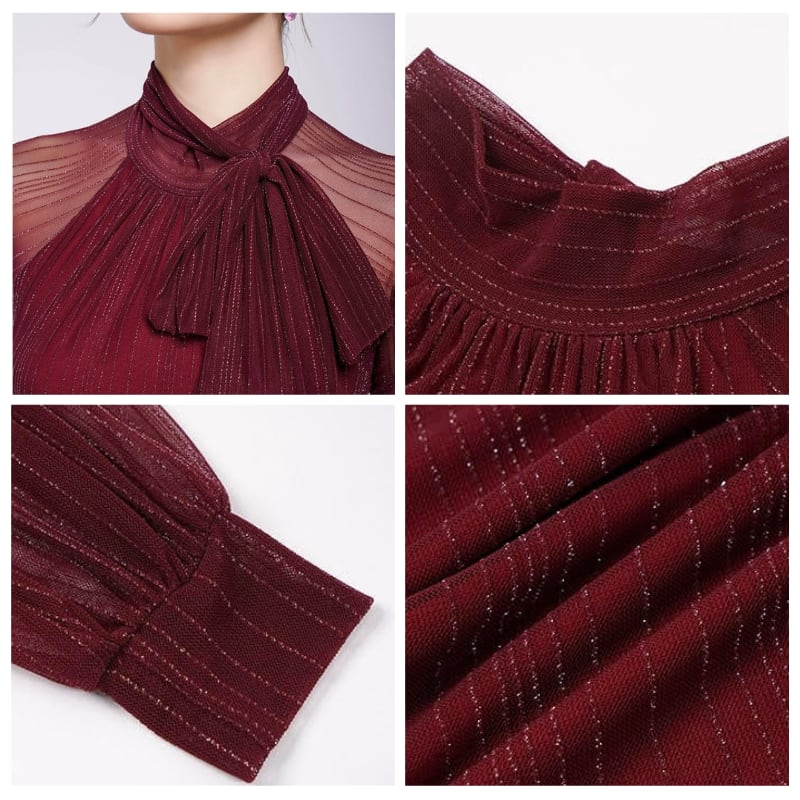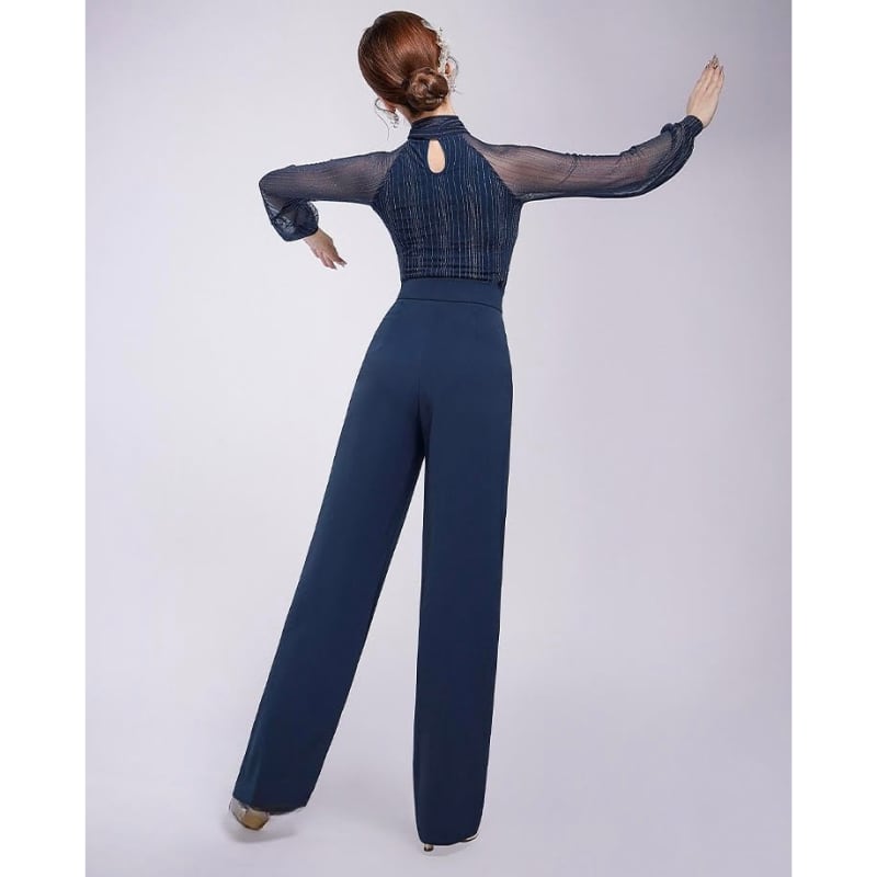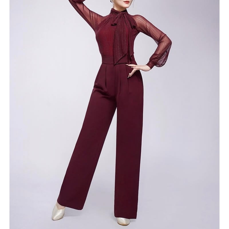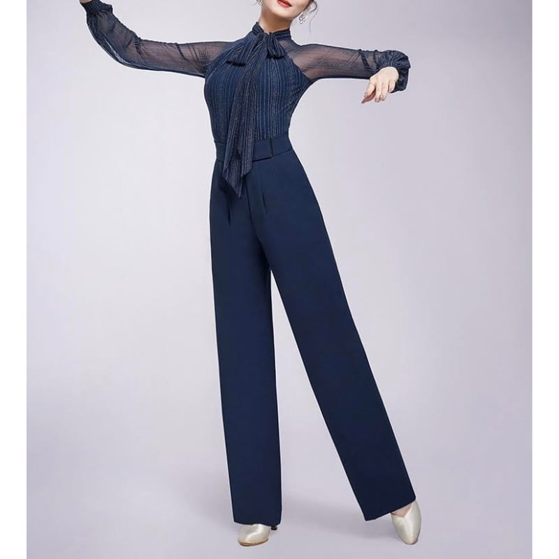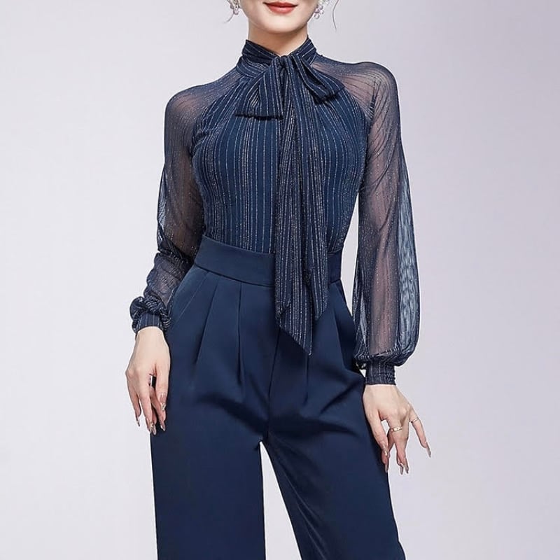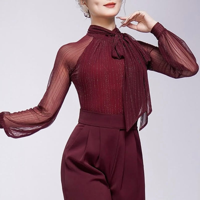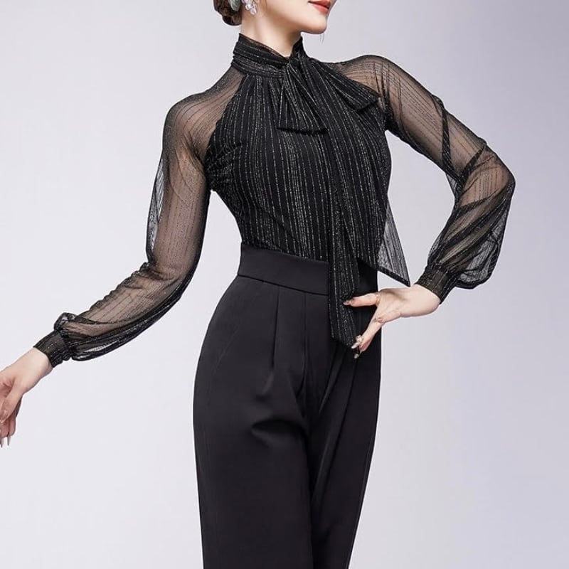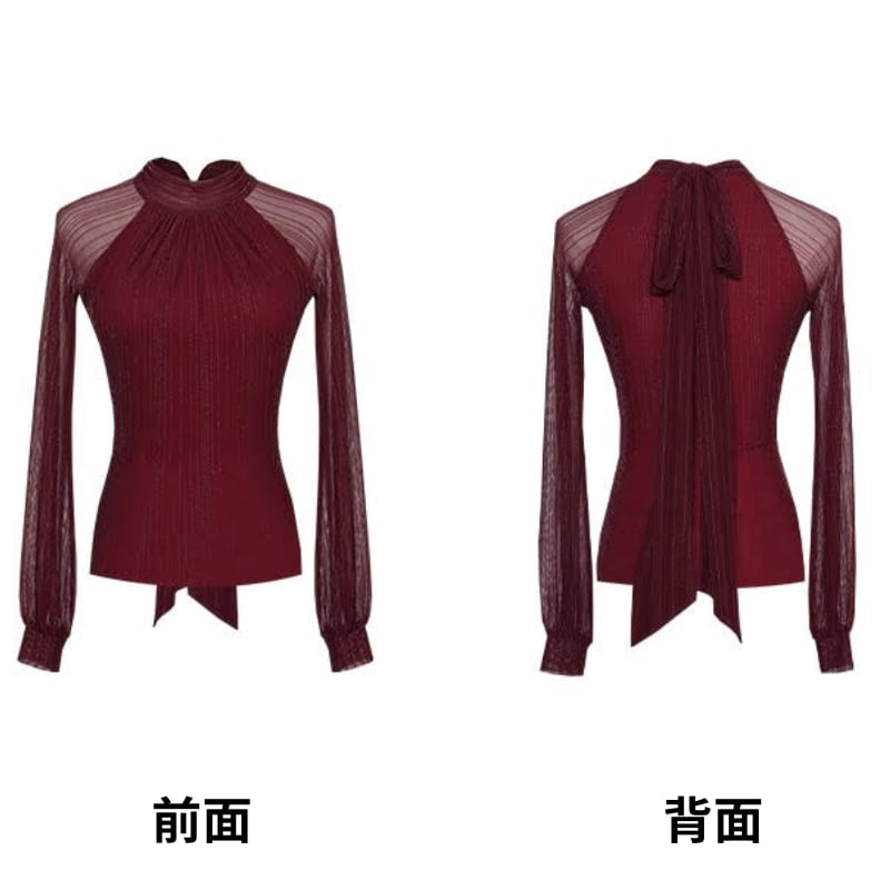 リボンタイ シアー ロングスリーブ エレガント ダンスブラウス 3col D00525