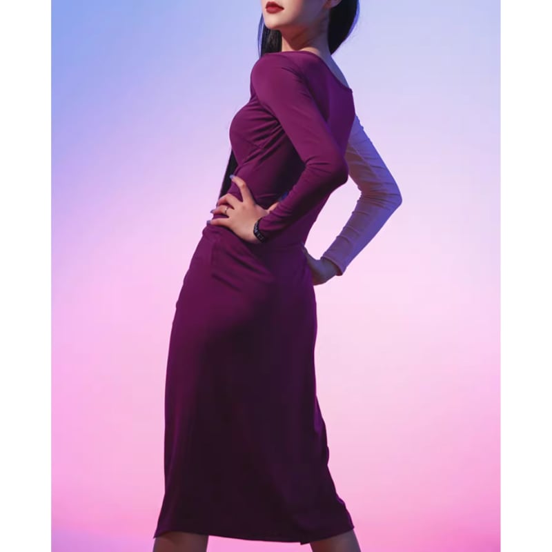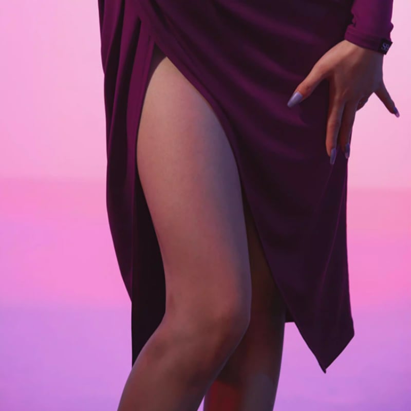 深く入ったスリットは、ステップを踏むたびに鍛えられた脚線美を覗かせ、洗練された色香を放ちます。