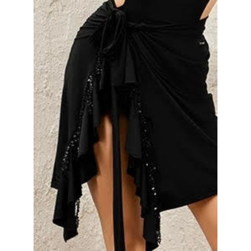 裾のスパンコールと優雅なラッフルが、腰の動きを華やかに強調する巻きスカート。