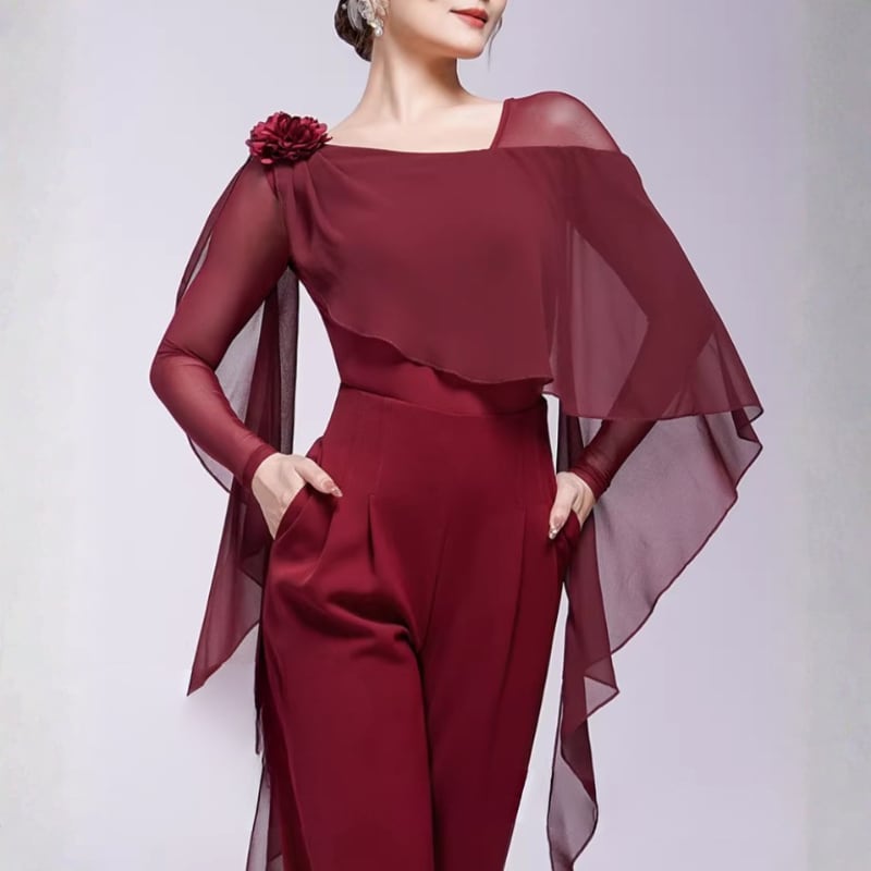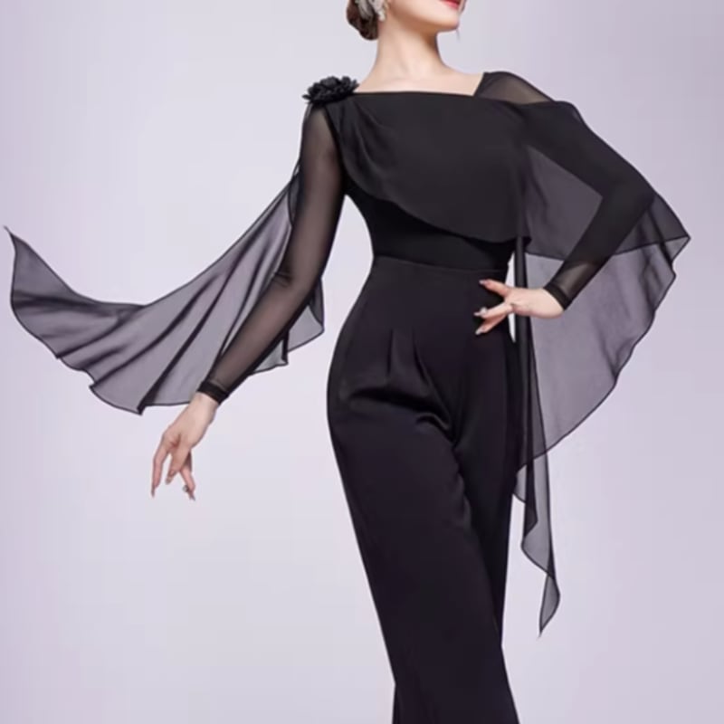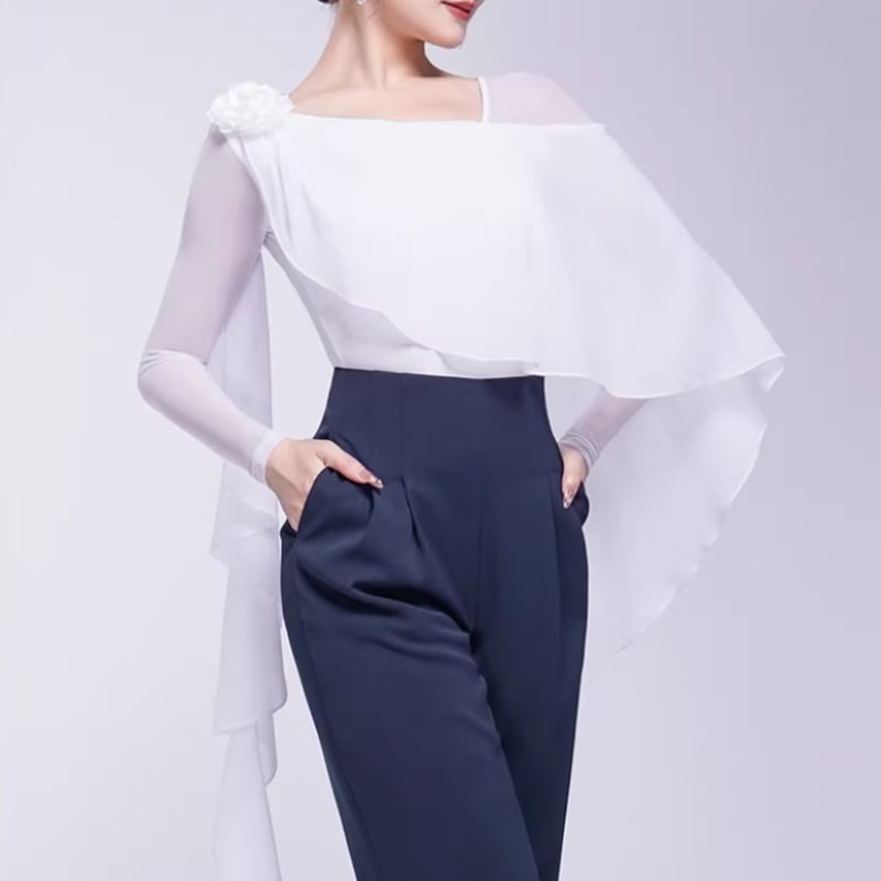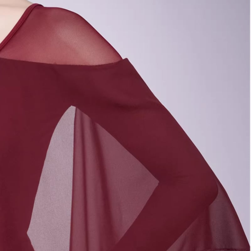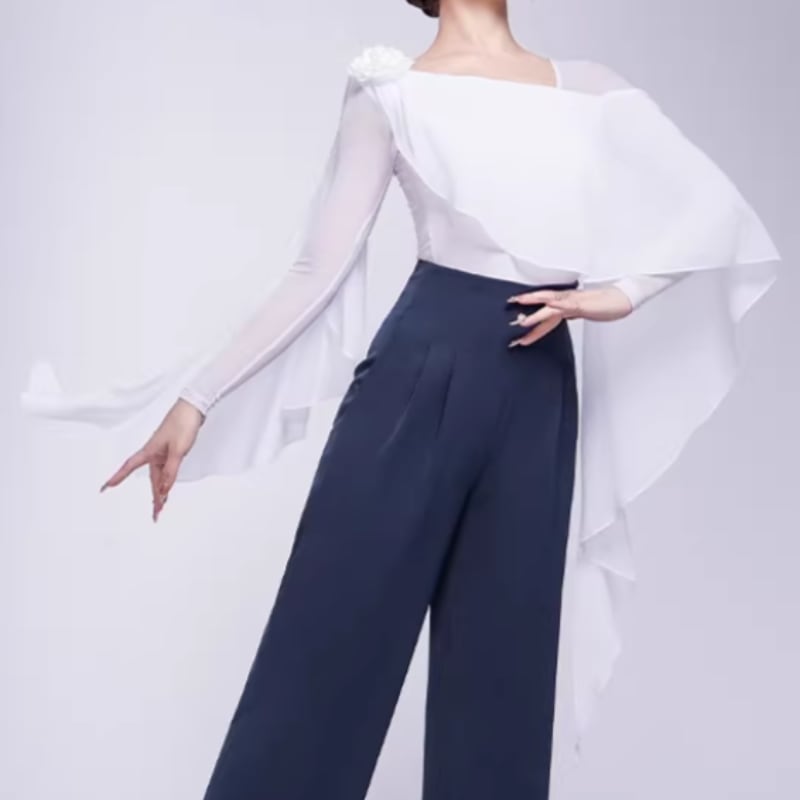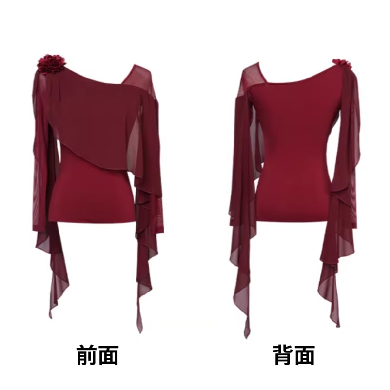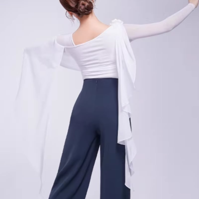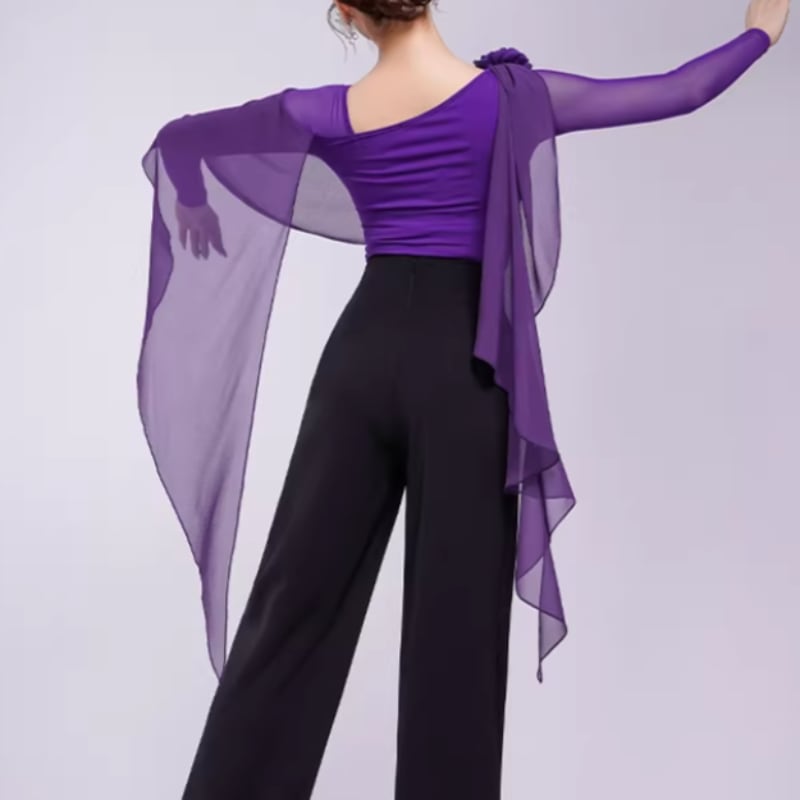 翼のように広がるシフォン袖が、腕の動きを優雅に見せるダンストップス。