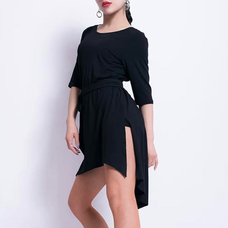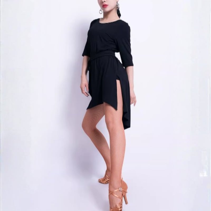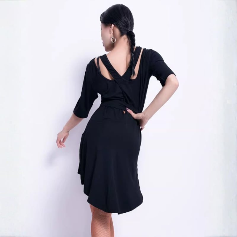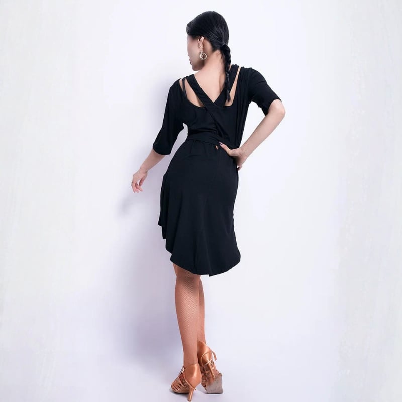 背中のクロスストラップが、後ろ姿の美しさを極めるデザイン性の高いラテンドレス。