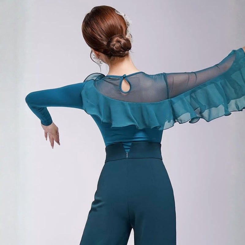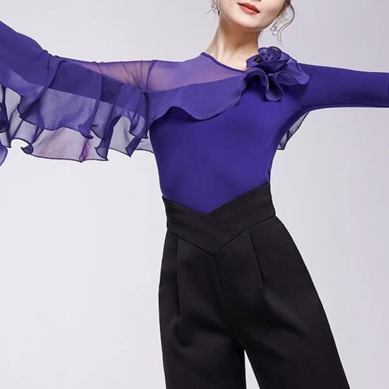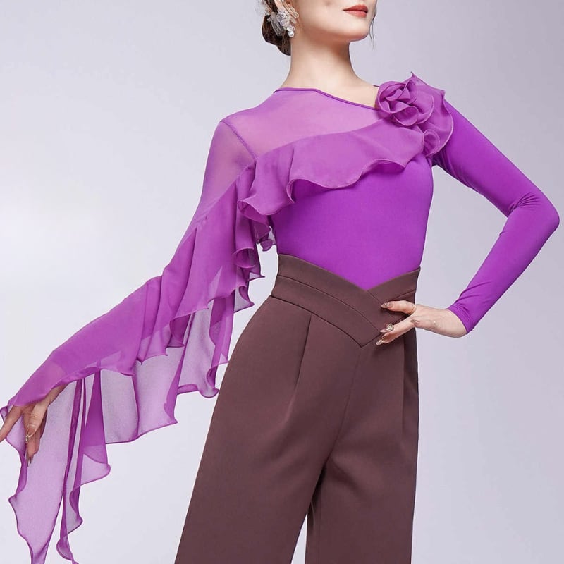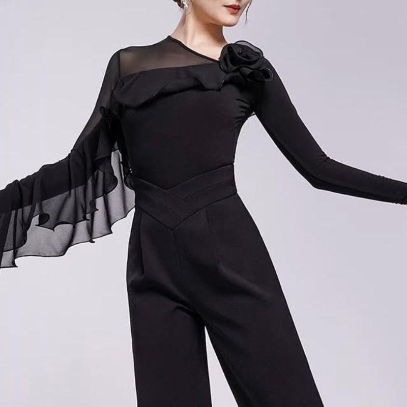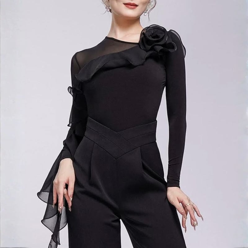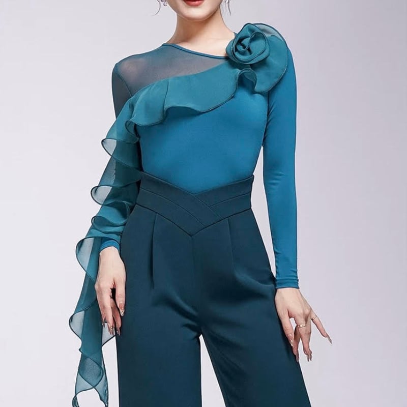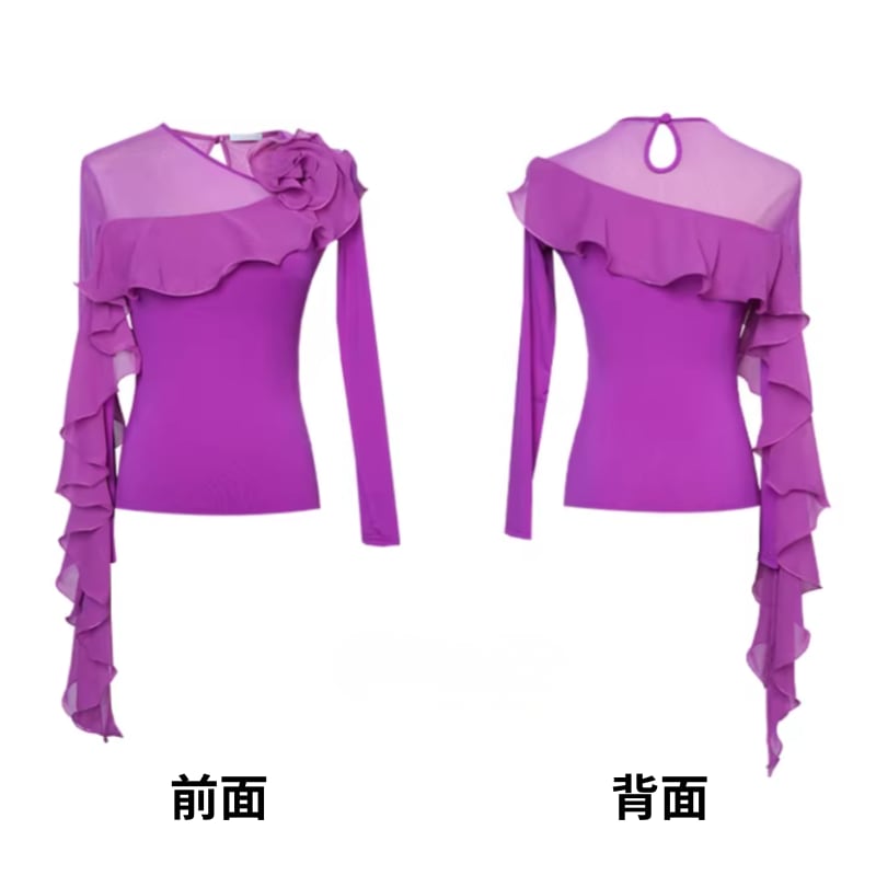 肩から流れるダイナミックなフリルが芸術的なデザイントップス。