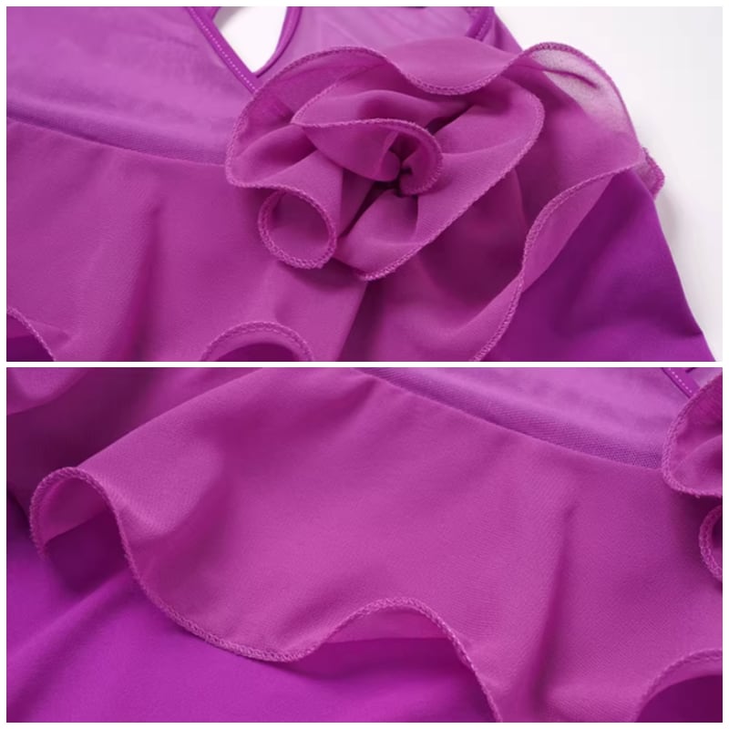 胸元のシアーな切り替えと立体的なフラワーモチーフが、顔回りに圧倒的な華やぎを添えます。