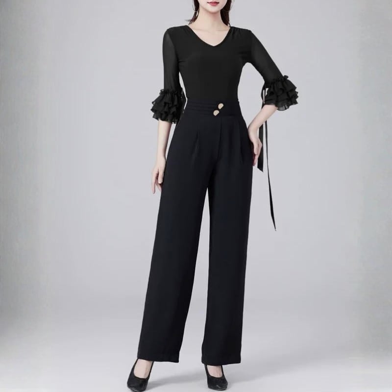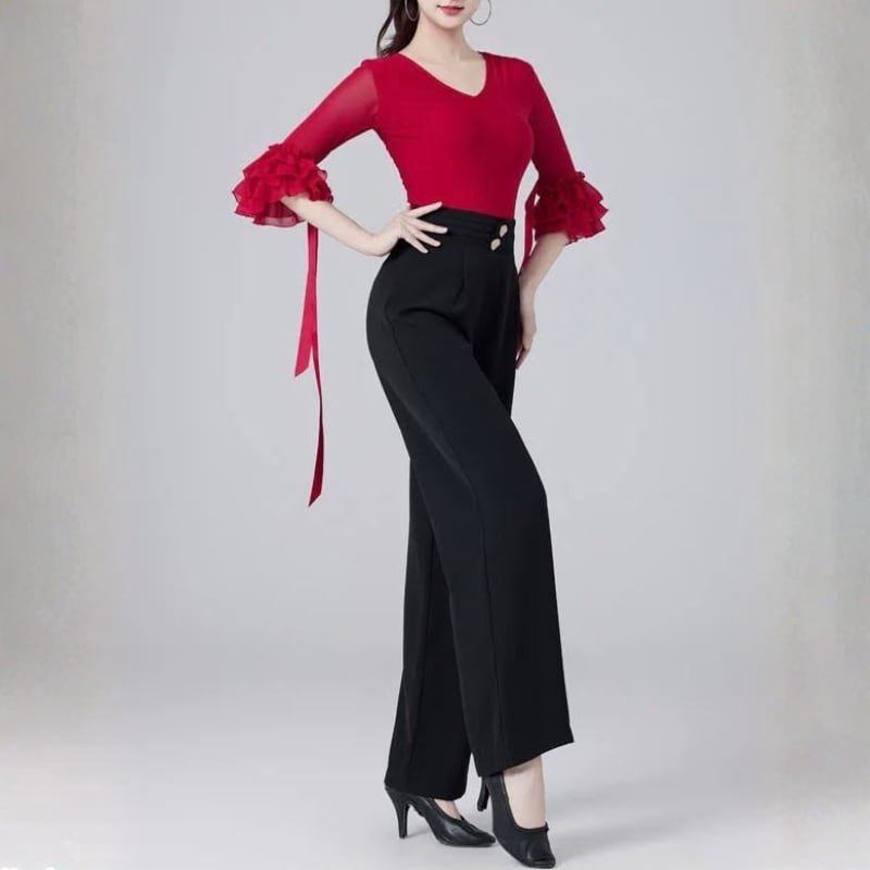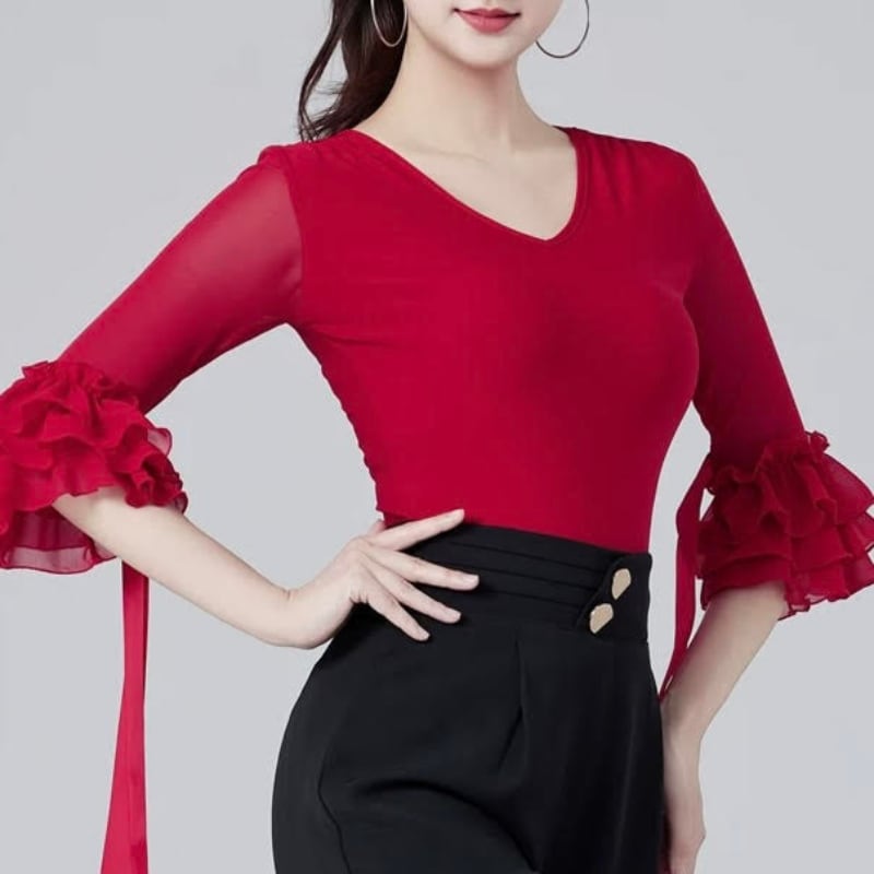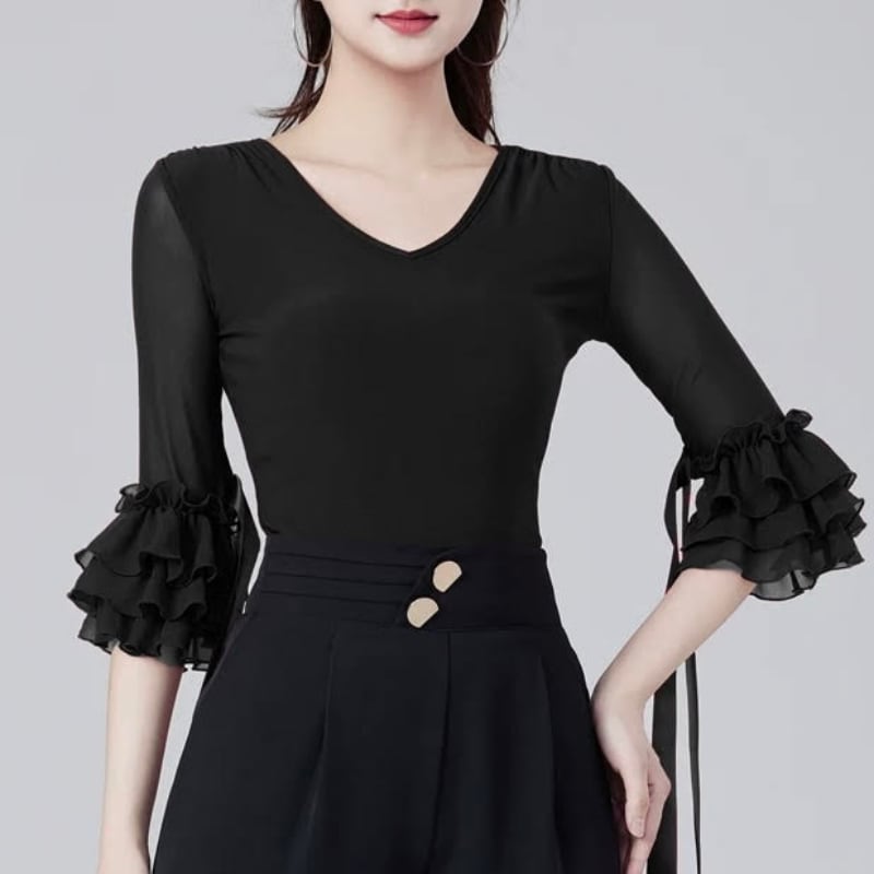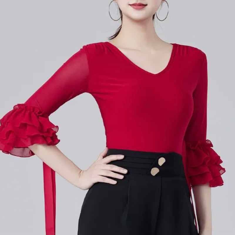 袖口の3段フリルがリズムに合わせて揺れ動く、華やかなVネックのダンスブラウス。