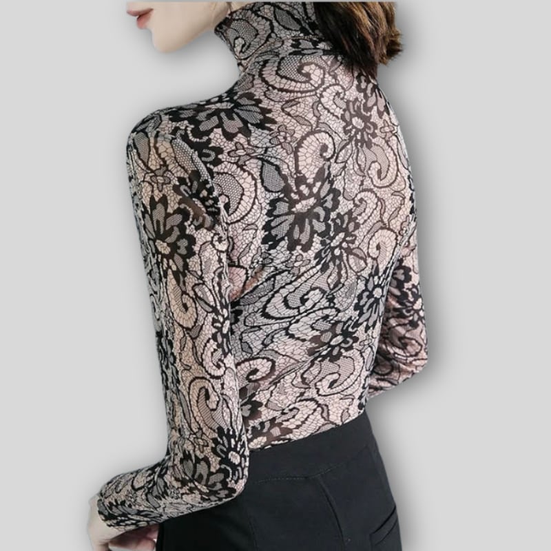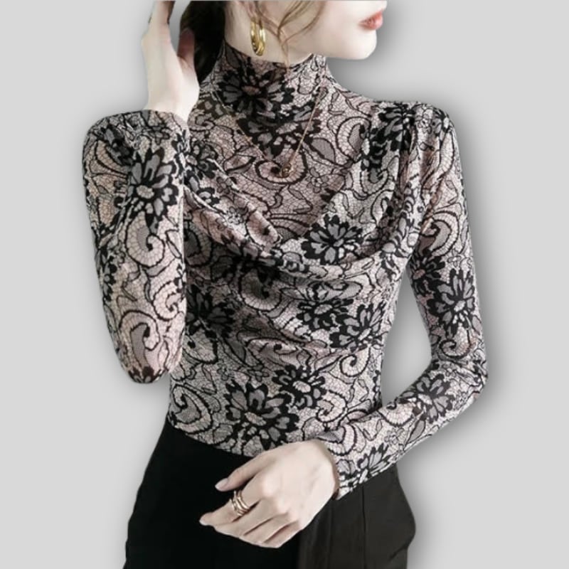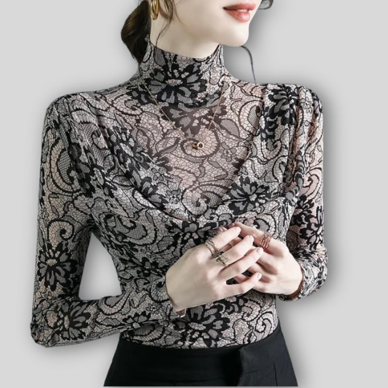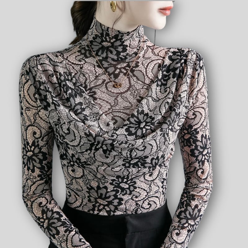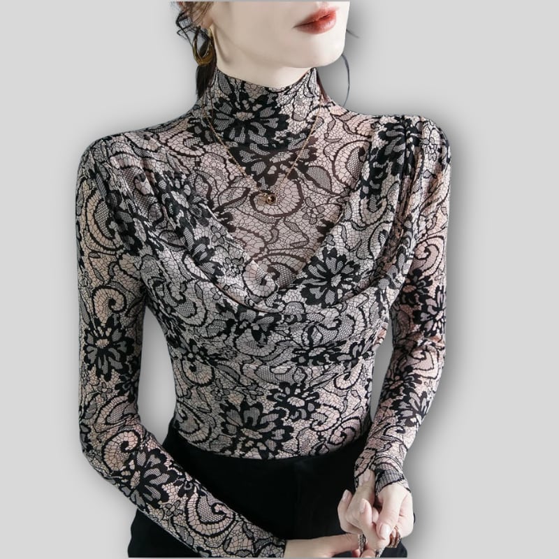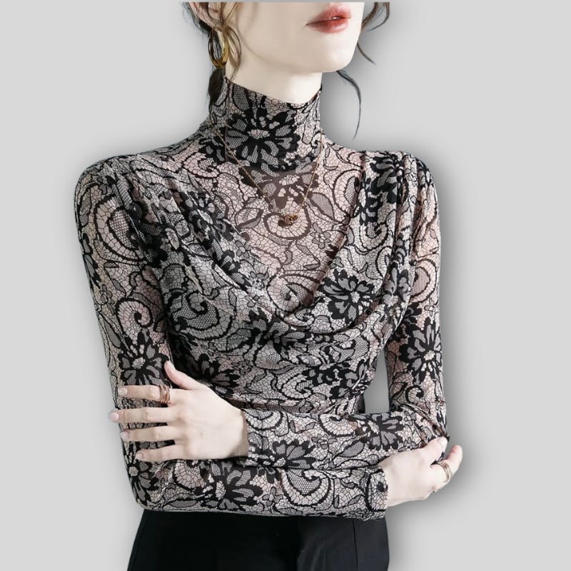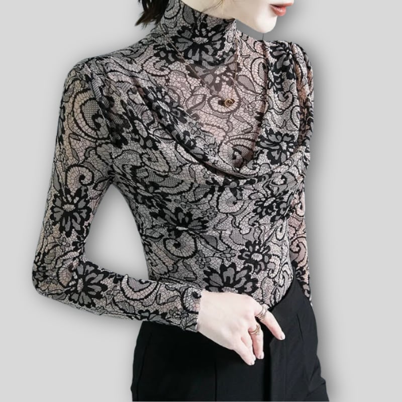 繊細なレース模様と胸元のドレープが調和する、知的な美しさのシアートップス。