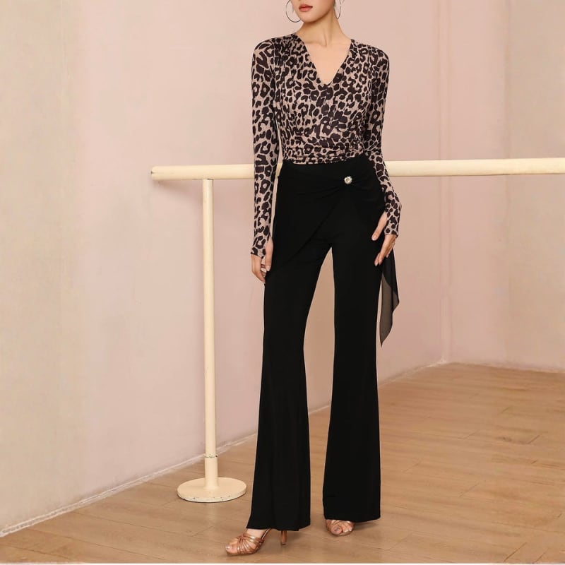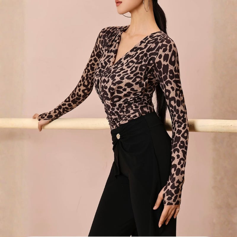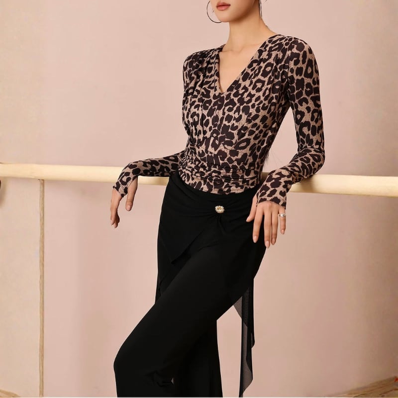 エッジの効いたレオパード柄と深いVネックが、都会的でクールな印象を与えるレオタードトップス。