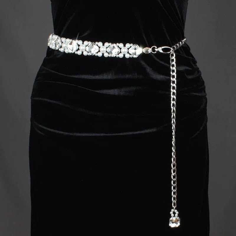 中央のビジューが照明を反射し、周囲の視線を一気にウエストラインへと惹きつけます。