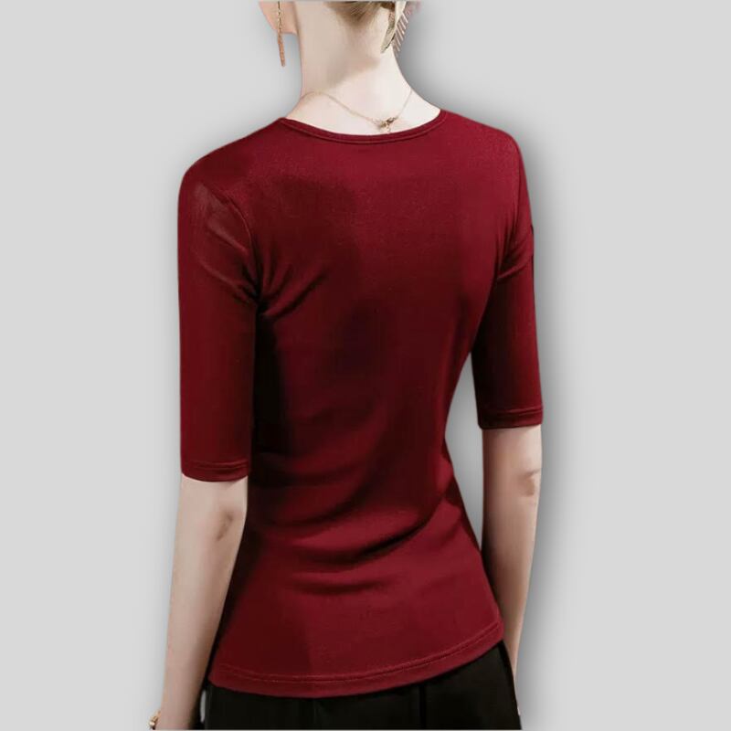 シンプルなスラックスと合わせることで、品格を損なわない大人のレッスン着として活躍します。