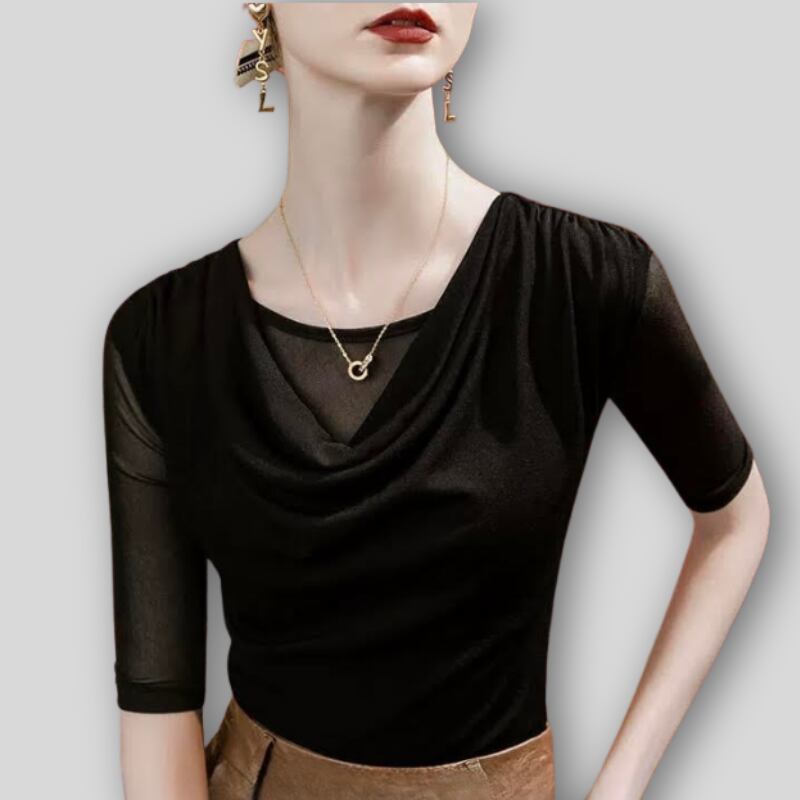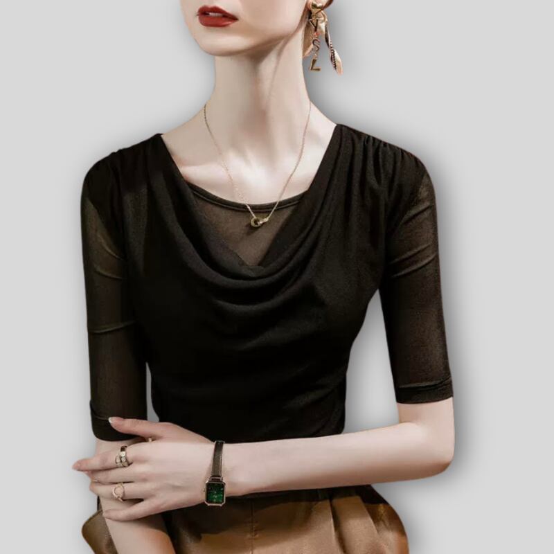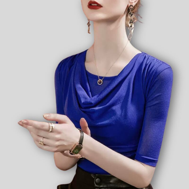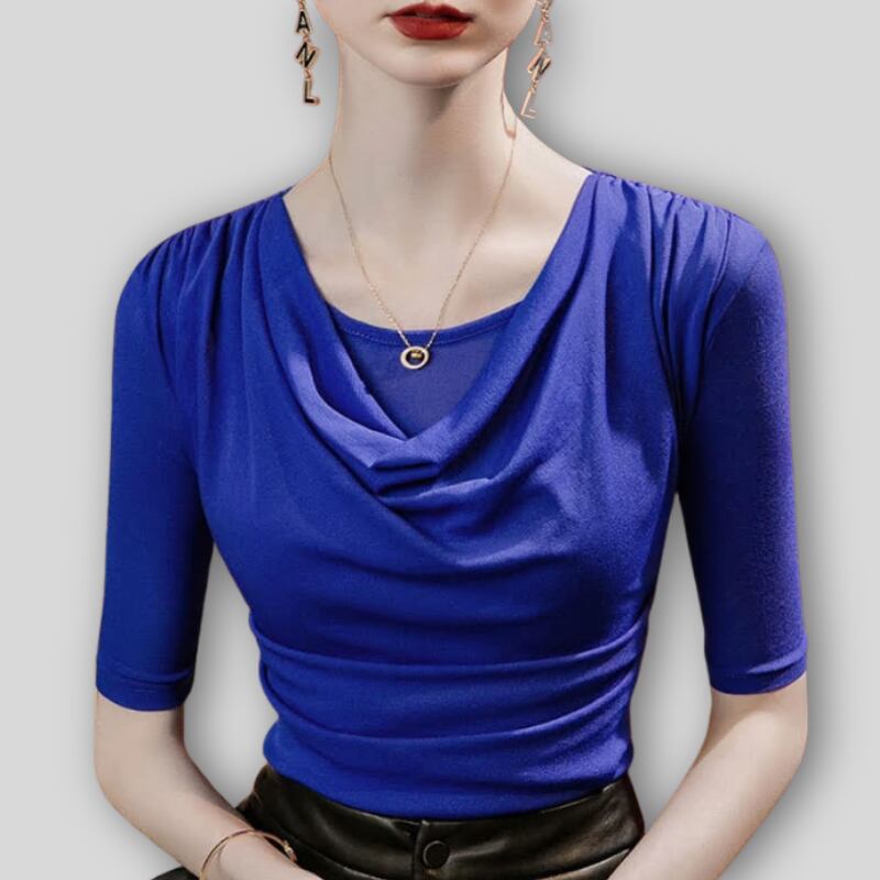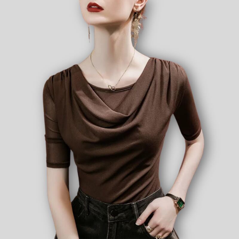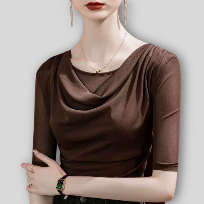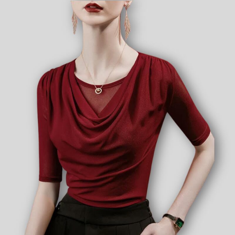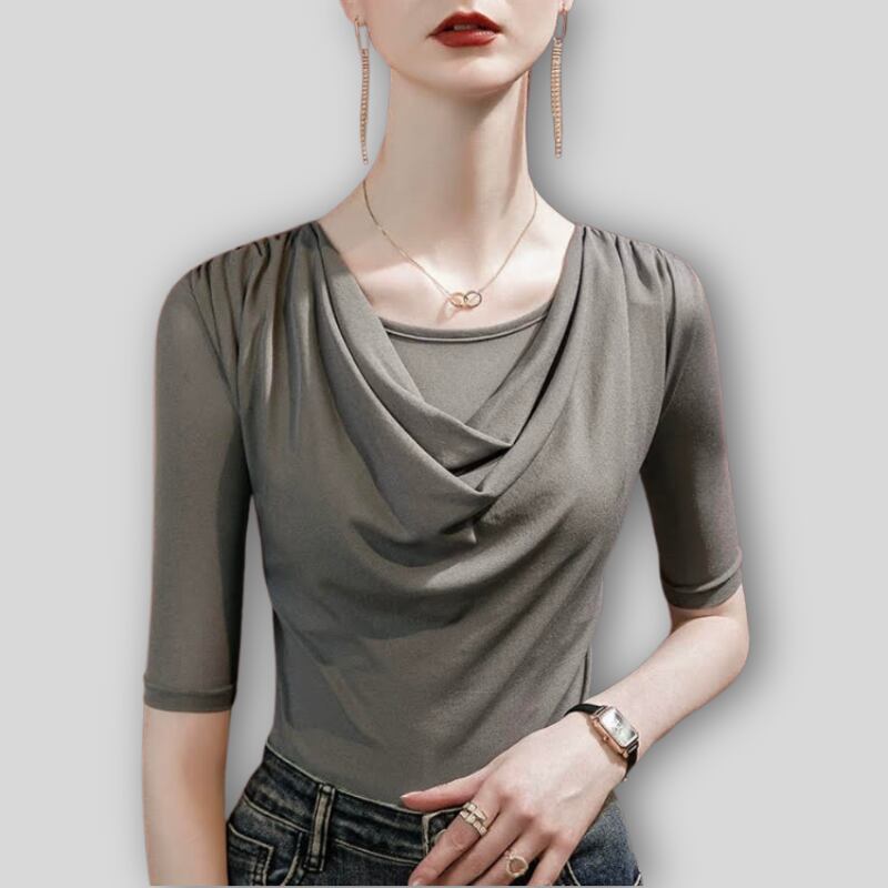 胸元の美しいドレープが柔らかな立体感を生み出す、ニュアンスカラーを取り揃えたダンストップス。
