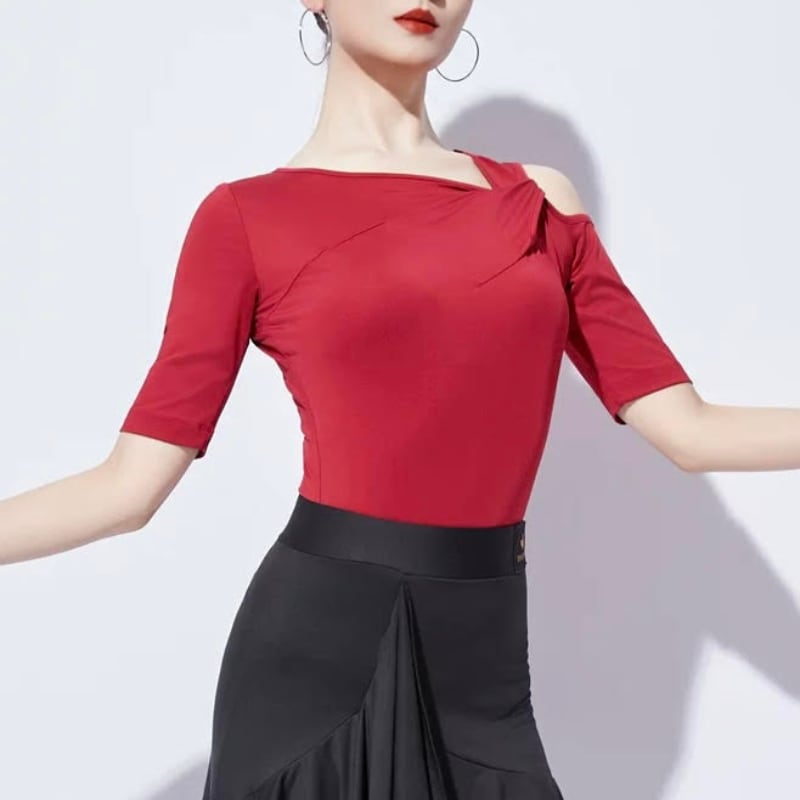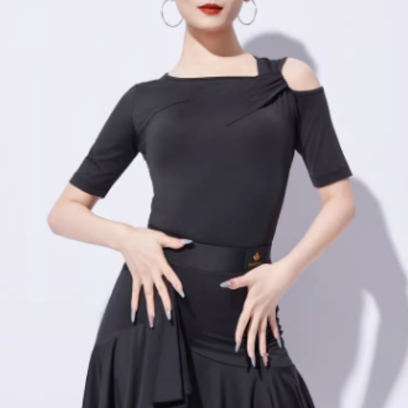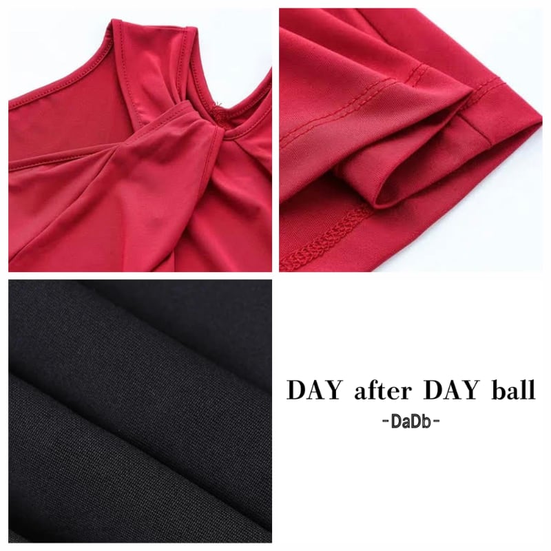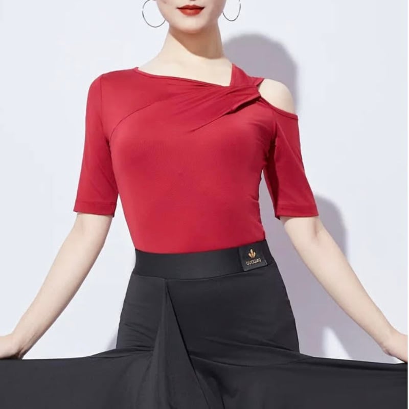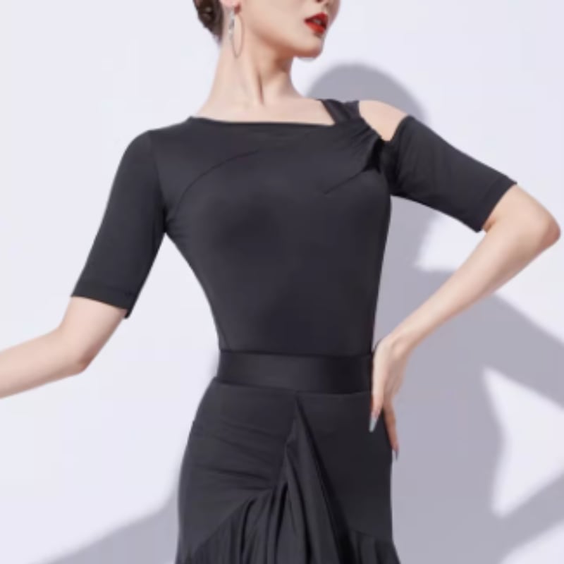 左右非対称のネックラインがデコルテを美しく彩る、モードな印象のダンストップス。