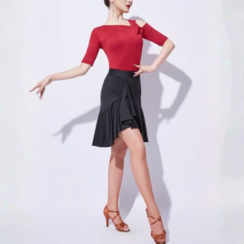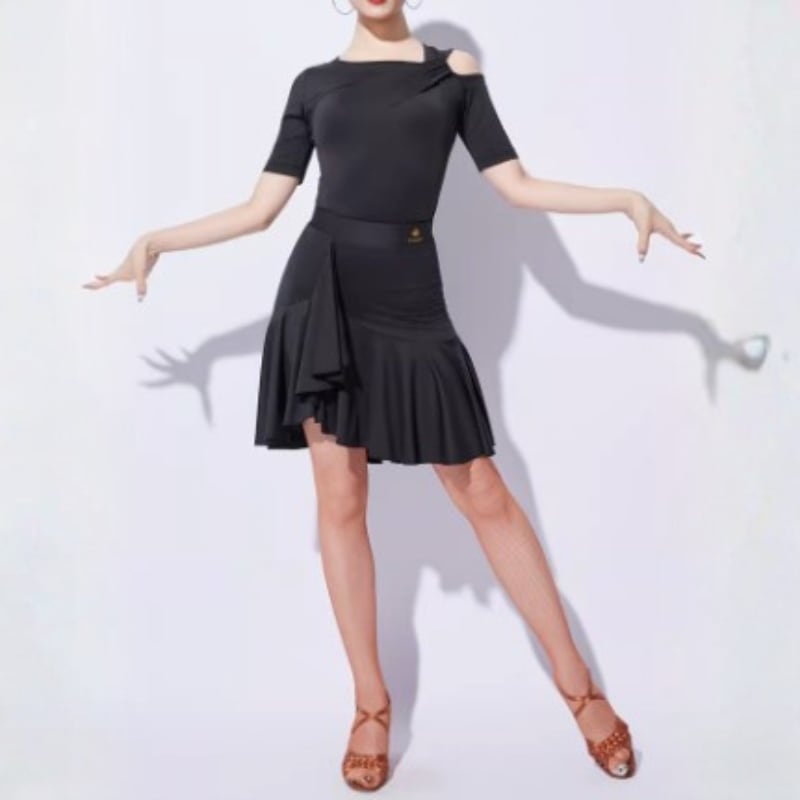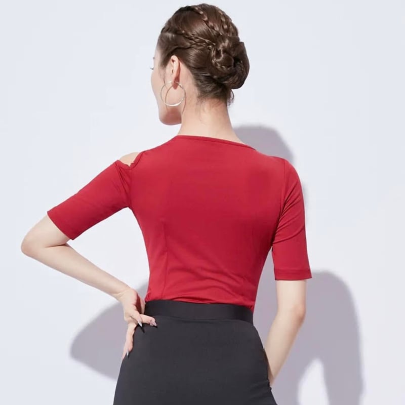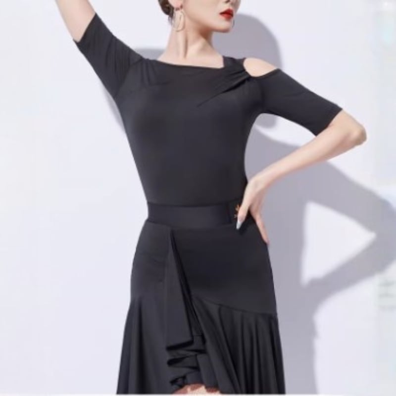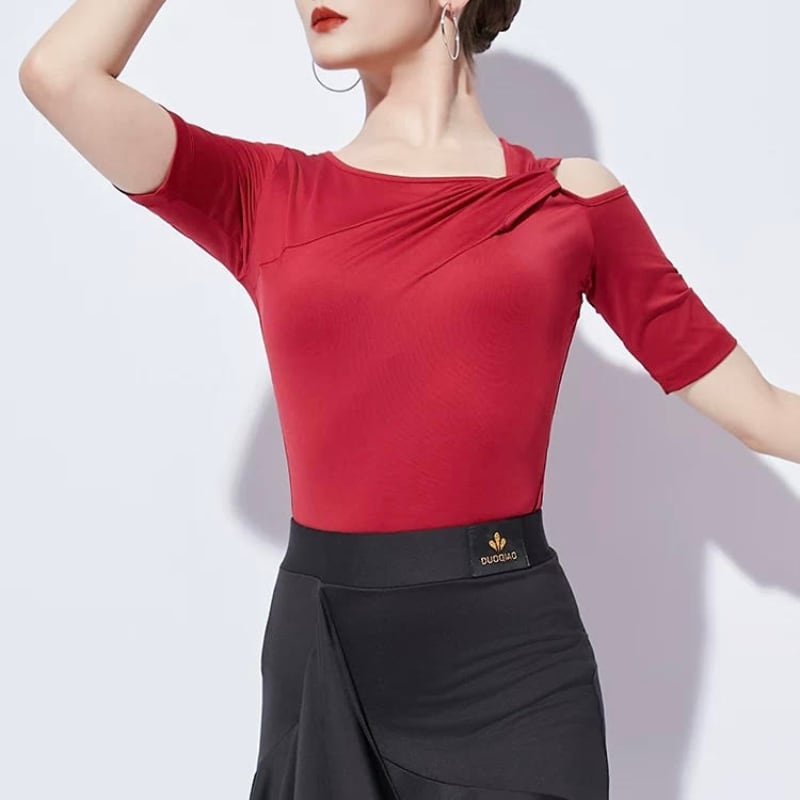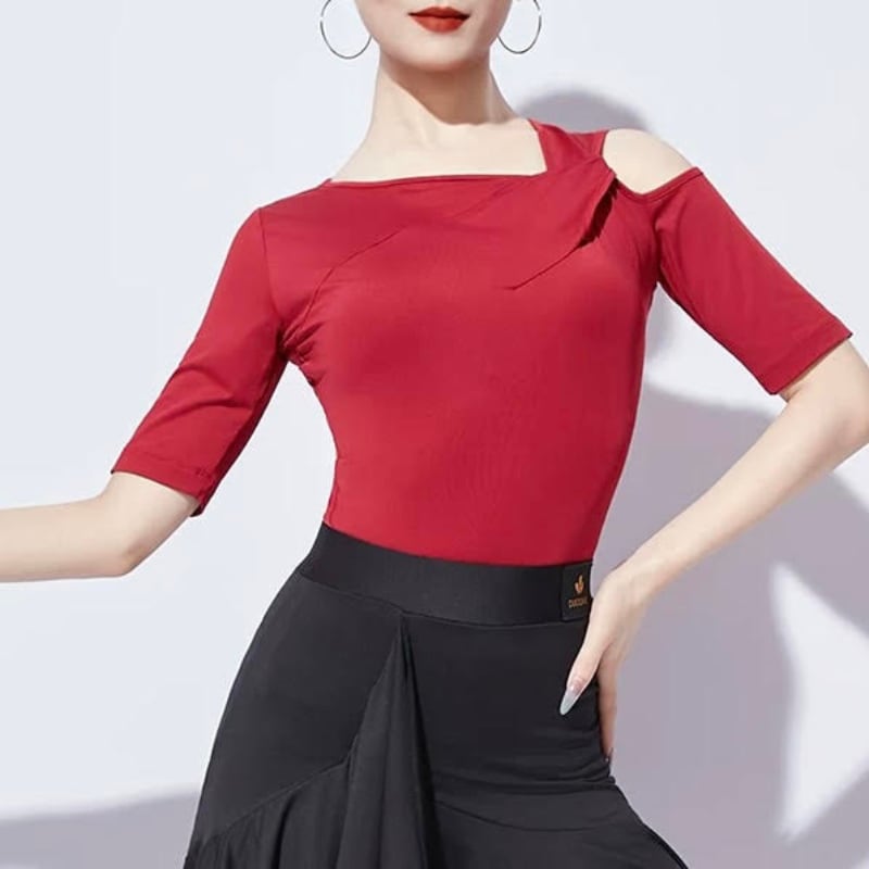 左右非対称のネックラインがデコルテを美しく彩る、モードな印象のダンストップス。