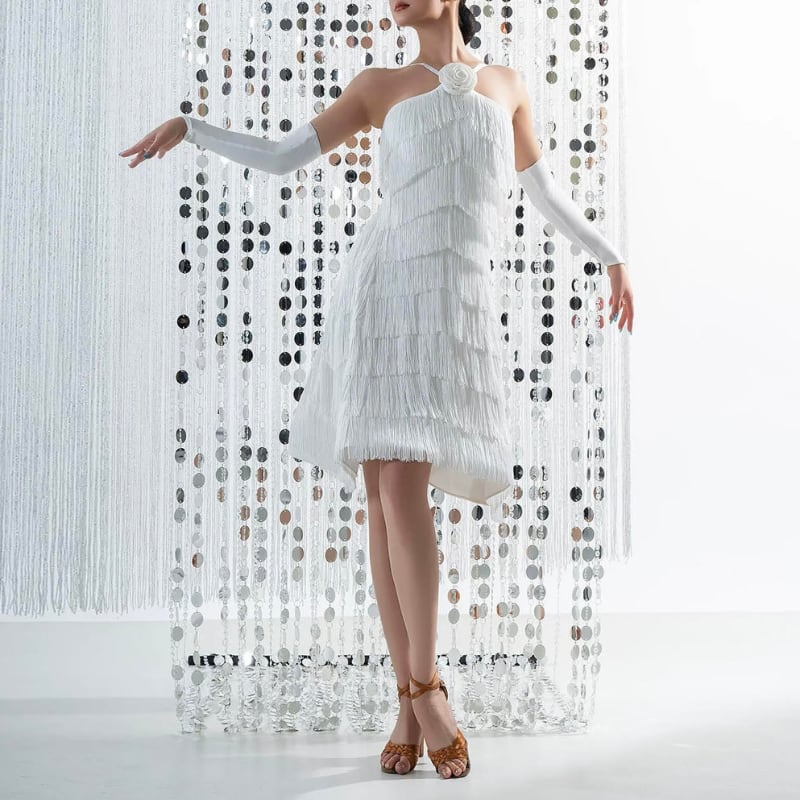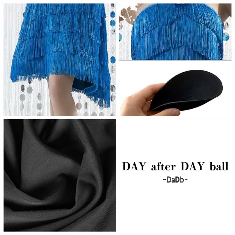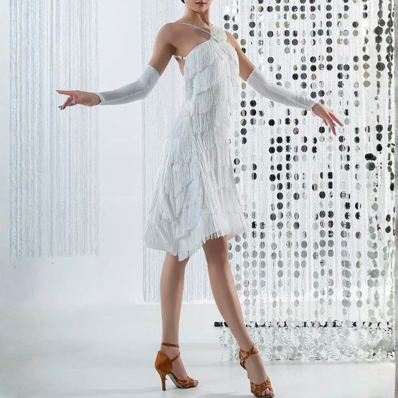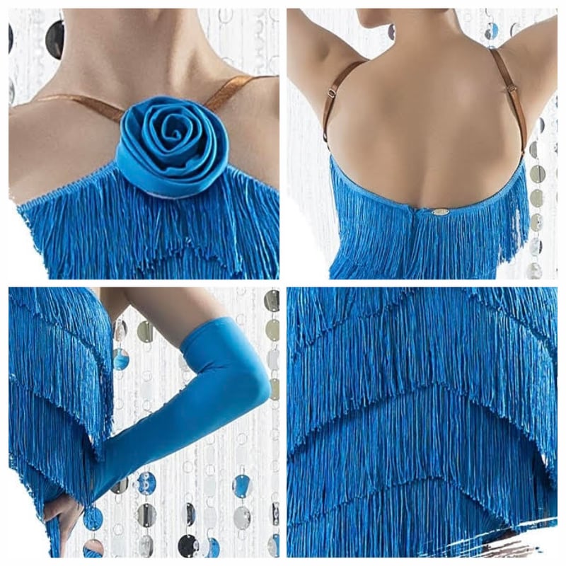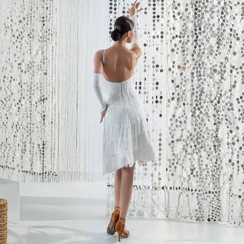 踊るたびに激しく揺れるフリンジが、ラテンダンスのスピード感とキレをより強調。