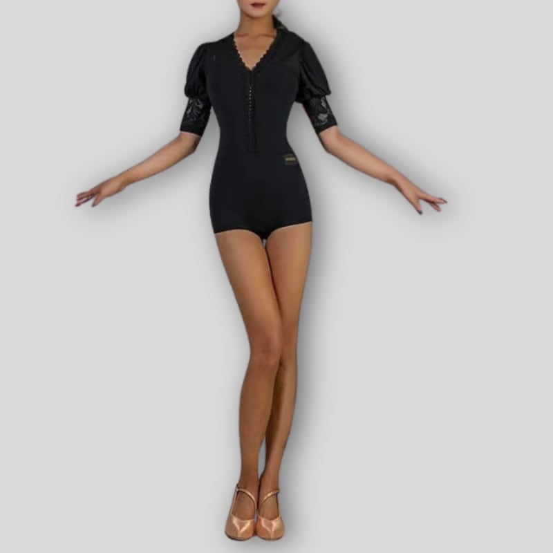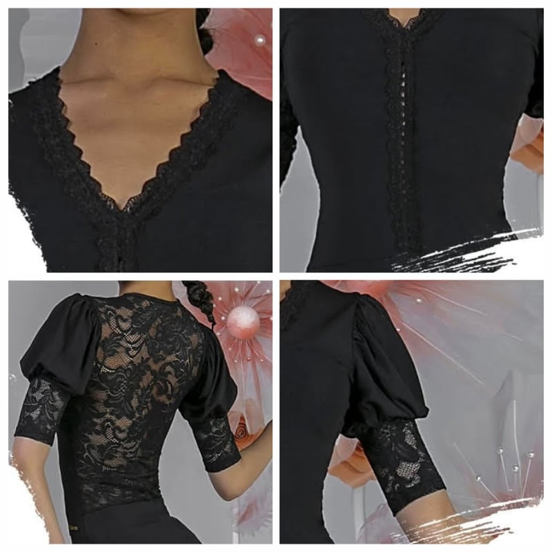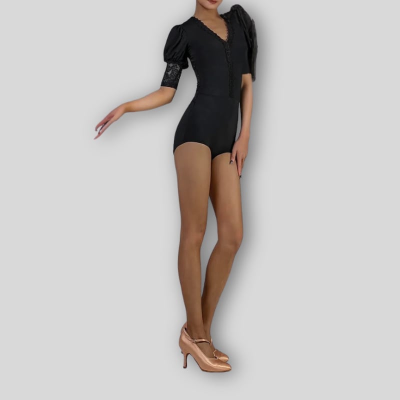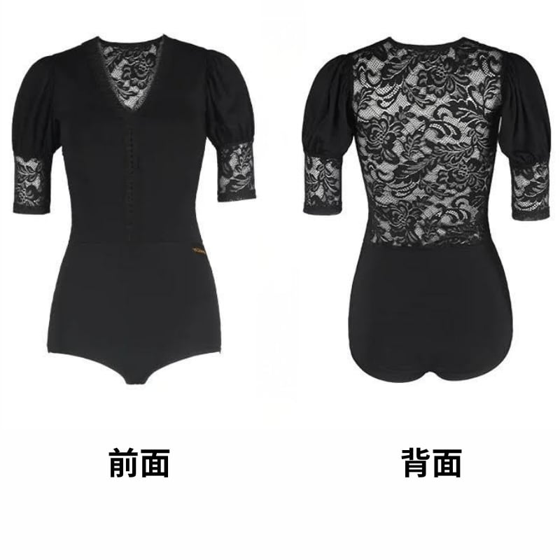 パフスリーブ Vネック レースコンビ レオタードトップス 1col D00613