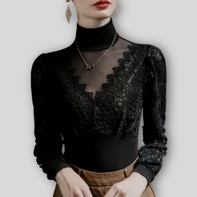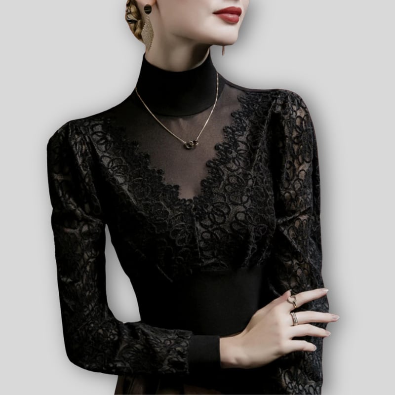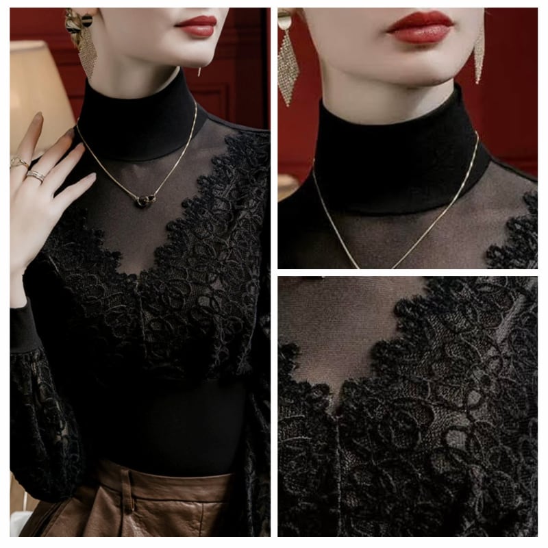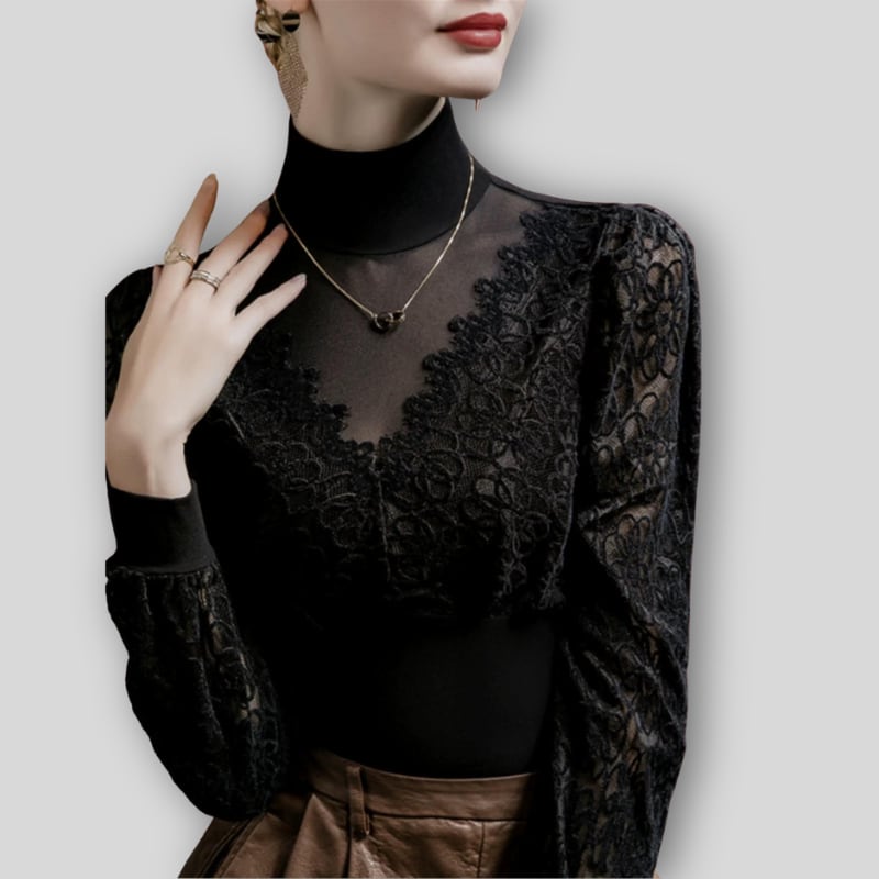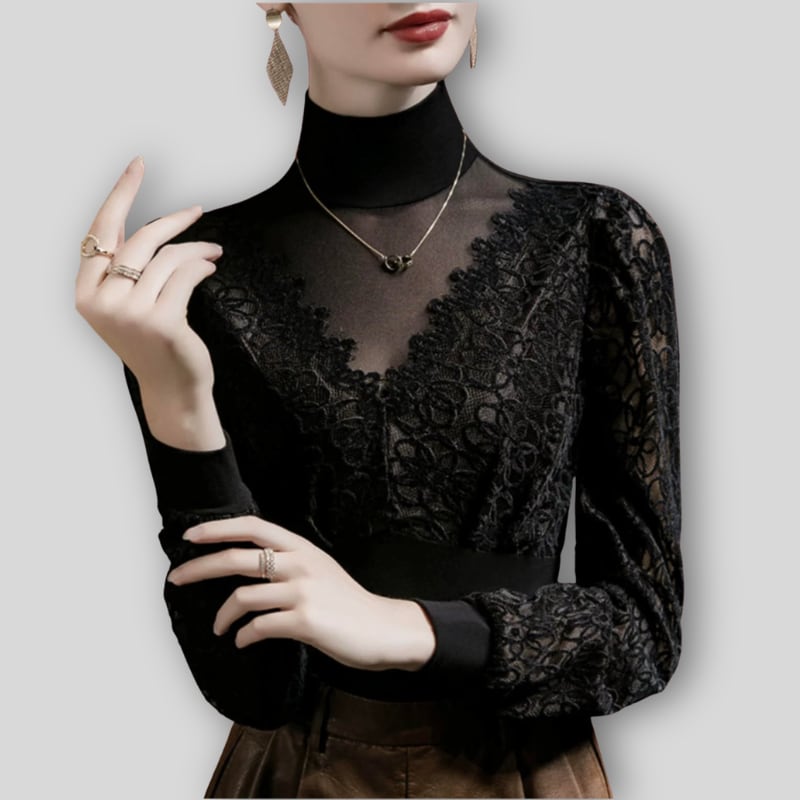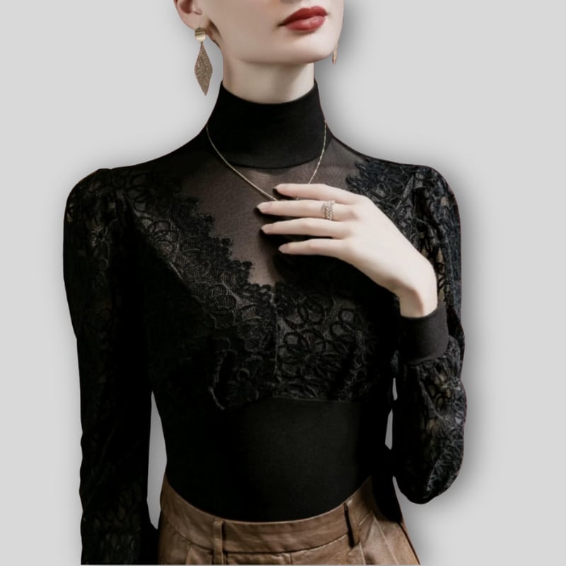 クラシカルなハイネックと、繊細なラッセルレースの組み合わせが上品なダンスブラウス。
