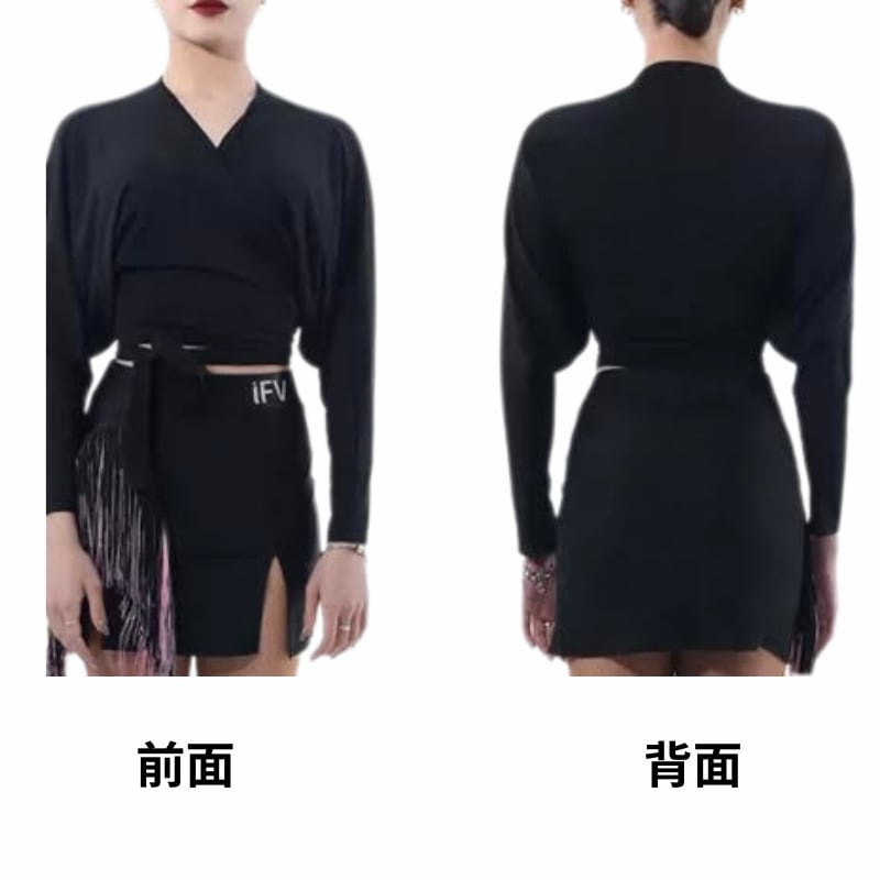 デコルテを美しく見せるカシュクールと、華やかなパフスリーブが目を引くブラックトップス。