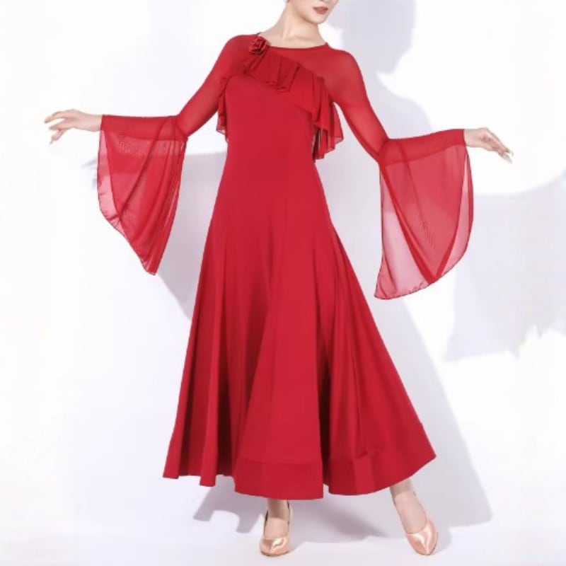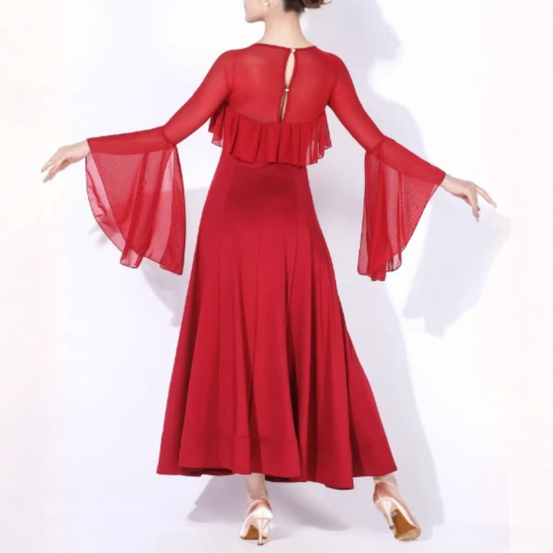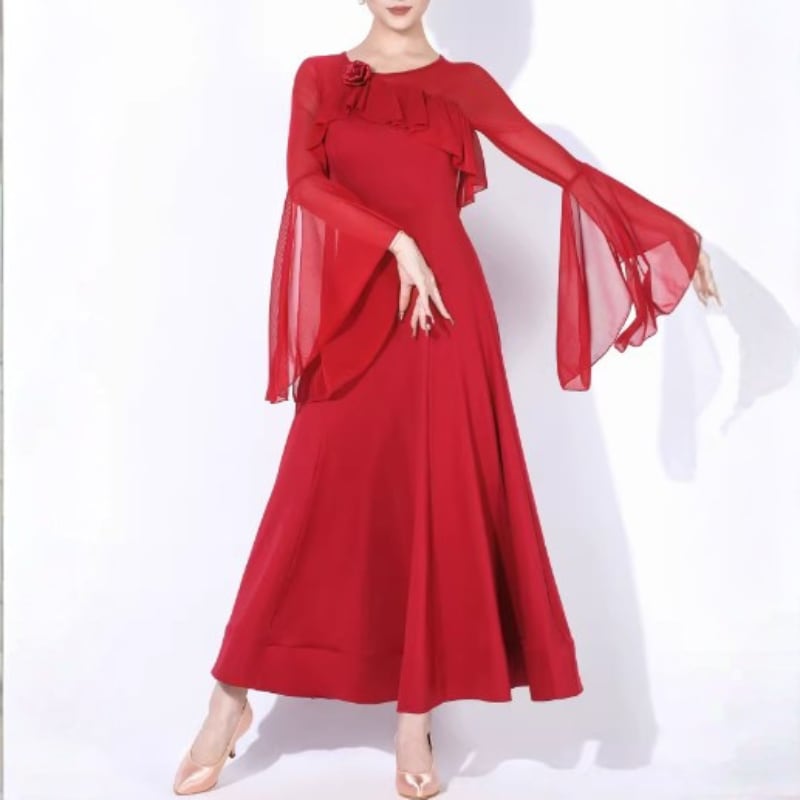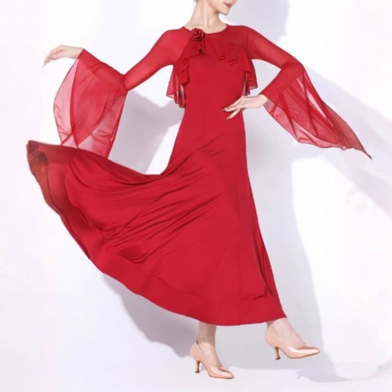 広がるスカートラインが流れるようなシルエットを演出します。