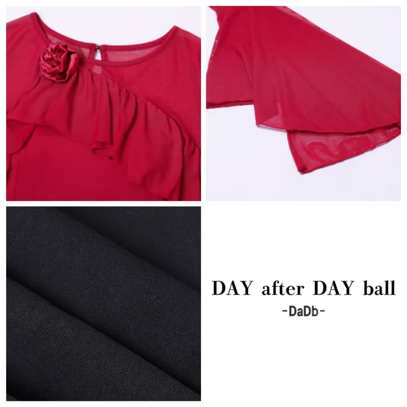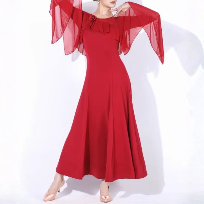 シフォンケープとデコルテ部分のフリルが印象的なモダンドレス。